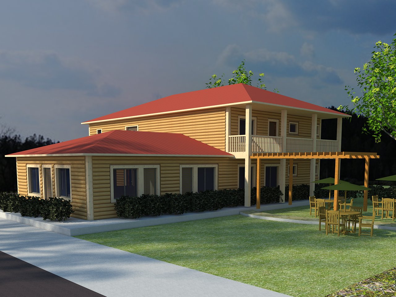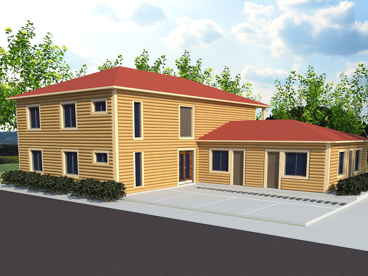 配套建筑部品:整體為輕鋼結構,屋面瀝青瓦+卷材防水(材料可選),木塑掛板復合保溫外墻(材料可選),石膏板內墻(材料可選),鋁合金門窗(材料可選)。