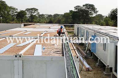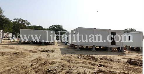 配套建筑部品:本項目用了14個40尺高柜和6個20尺柜拼接組成。外墻噴刷油漆,石膏板內墻(材料可選),鋁合金門窗(材料可選)。
